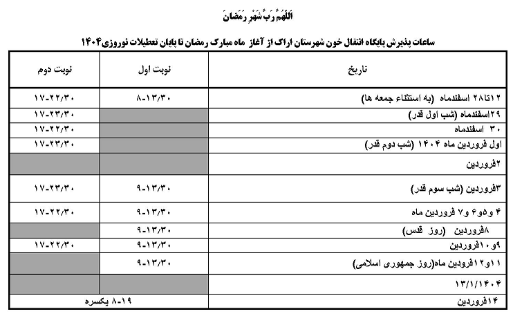 اعلام ساعات پذیرش اهدا کنندگان محترم در پایگاه انتقال خون شهرستان در ماه مبارک رمضان ۲۸ اسفند ۱۴۰۳ | ۱۳:۰۸ کد : ۵۰۲۶۹ اطلاعیه ارسال به دیگران نام شما ایمیل شما ایمیل دریافتکننده ارسال انصراف تعداد بازدید:۷۰۷۷ اعلام ساعات پذیرش اهدا کنندگان محترم در پایگاه انتقال خون شهرستان در ماه مبارک رمضان